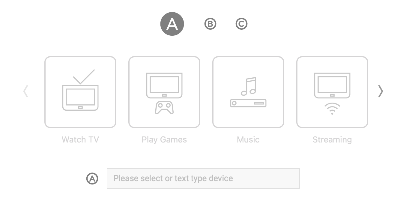 First, we have Activities. An Activity is something you can do with your remote and your tech devices, like watching TV or streaming content. Every Flirc remote can have 3 activities, and you can select between them by hitting the A, B, and C keys on your remote control.